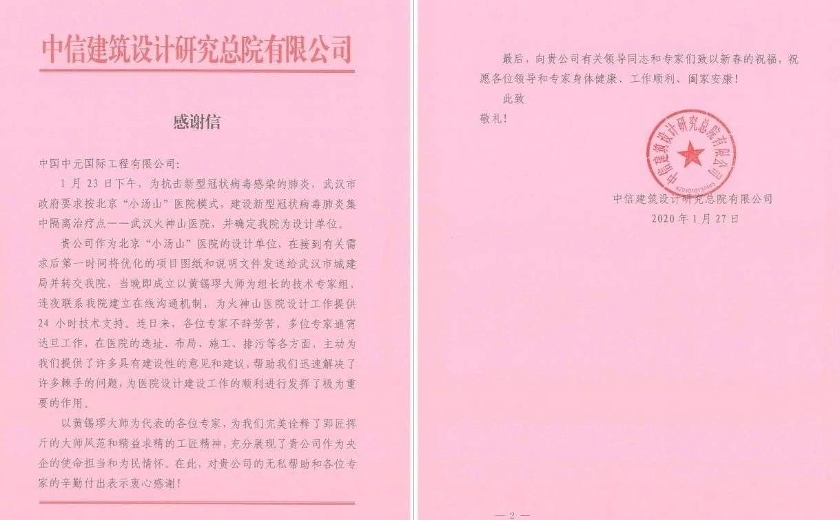武汉市火神山医院顺利建成、并投入使用,1 月 27 日,开云网页版页面收到了来自中信建筑设计研究总院有限公司(以下简称“中信设计院”)发来的感谢信。中信设计院在信中表示,开云网页版页面第一时间送达小汤山医院图纸,并提供 24 小时技术支持,帮助其解决了设计过程中的诸多棘手问题,推动了医院设计建设工作的顺利进行。中信设计院对开云网页版页面的无私帮助和辛勤付出表示感谢,对黄锡璆博士郢匠挥斤的大师风范表达了敬意。